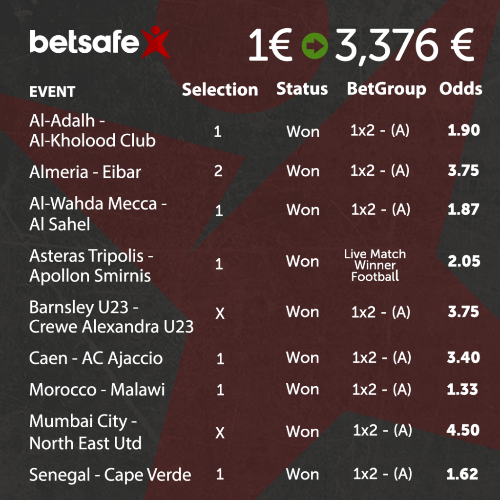 Pavisam nesen ar iespaidīgu laimestu izcēlies kāds “Betsafe” klients, kurš izdarīja vairākas prognozes uz futbolu, kā rezultātā ieguldītais viens eiro pārvērtās vairāk nekā 3,3 tūkstošos eiro!