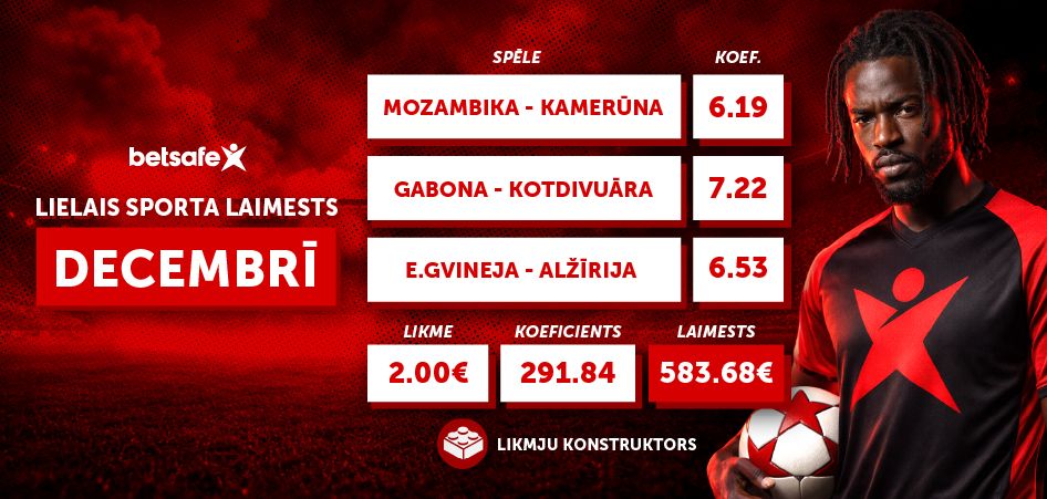 Decembrī sākās Āfrikas Nāciju kauss futbolā, un jauno gadu kāds “Betsafe” klients sagaidīja ļoti labā noskaņojumā. Viņš izvēlējās trīs no četrām 31. decembra spēlēm un izmantoja “Bet Builder” funkciju, katrā mačā atzīmējot vairākas izvēles. Koeficienti bija augsti (6.53, 7.22 un 6.19), un to reizinājums veidoja 291.84. Likmes vērtība bija divi eiro, un visi notikumi piepildījās, līdz ar to klients iesoļoja 2026. gadā ar papildu 583,68 eiro!
