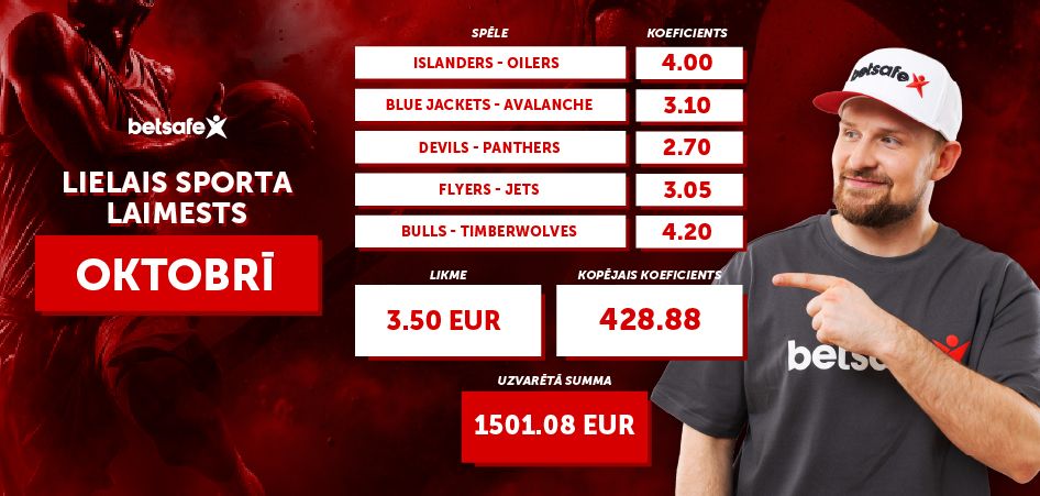 Mēneša lielākais koeficients izgāja oktobra vidū. Izvēloties četras NHL spēles, katrā no tām tika prognozētas uzvarētājas un kopā gūto vārtu skaits, bet vienīgajā NBA likmē prognoze bija par uzvaras starpību. Koeficientu reizinājums deva 428.88, bet likmes apjoms bija 3.50 eiro. Visi notikumi piepildījās, un 1501.08 eiro laimests bija kabatā!